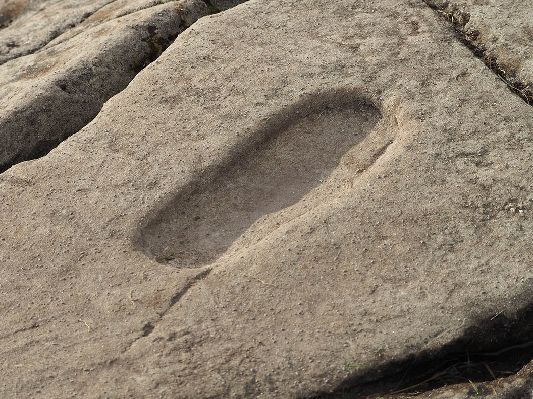 Dunadd itself, between Kilmichael Glassary and Kilmartin village, is a classic stronghold-on-a rocky-eminence, reminiscent of Cashel or Dunamase in Ireland. It may once have been an island in a shallow bay. There are traces of Iron Age occupation before the establishment of Dalríada, and carving of a boar in distinctly Pictish style, but most of the remains relate to the period of the Gaelic kingdom, Dal Ríada (or Dalriata, etc.). At the height of the fort there is a carved impression of a footprint which (it is believed…) was used in the inauguration of kings. It’s a powerful place, with great vistas off down the valley and to the coast. When you get to that rock with the footprint, you just have to put your foot into it.