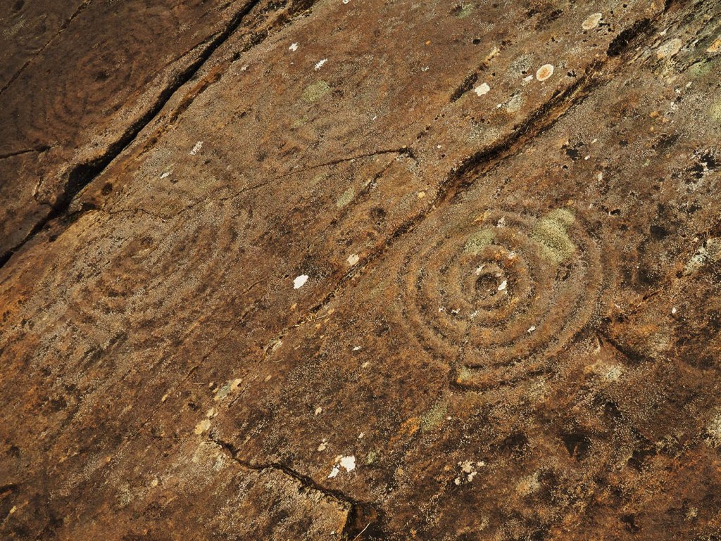 We approached Dunadd from the south, taking time to see “cup and ring” rock markings around Kilmichael Glen (see image below). A lot of the land around this part of Scotland is surprisingly lush, with beech woods growing right on the coast, and the sense of a temperate climate, quite distinct from some parts of the highlands. We were lucky to encounter a group from an archaeology field-school who were surveying a cup-marked stone called the Lion Stone at Kilmichael. They gave us great advice about where to go and what to see. There are some amazing arrays of ancient rock art up mad trails in the forestry nearby, and it’s notable that the heartland of Dal Ríada was in an area that had been culturally important many centuries earlier. The Kilmartin valley, in which the royal citadel of Dunadd is situated, has a linear series of cairns, stone circles and stone alignments from the Neolithic and Bronze ages.